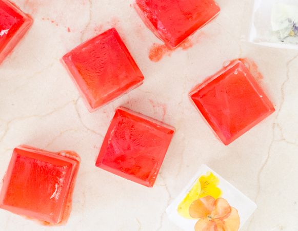 Очень красиво смотрятся льдышки со съедобными цветами. К съедобным цветам относятся фиалка, ромашка, гибискус, жасмин, лаванда, настурция, роза . Просто залейте емкость для льда наполовину водой, положите в каждую ячейку по цветочку и в морозильник.