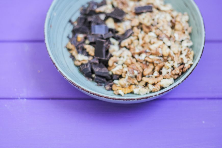 Следом добавляем шоколад и орехи, тщательно перемешиваем.